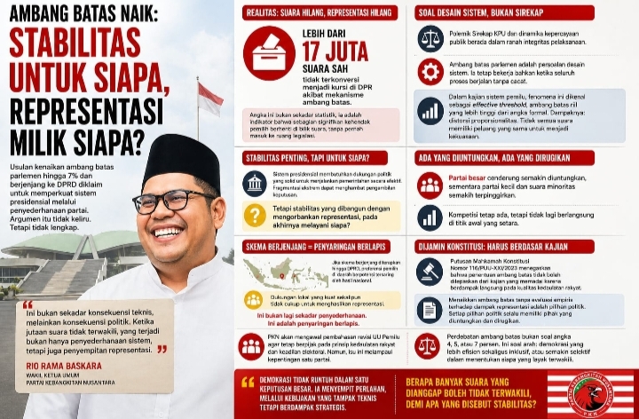 “Ini bukan sekadar konsekuensi teknis, melainkan konsekuensi politik. Ketika jutaan suara tidak terwakili, yang terjadi bukan hanya penyederhanaan sistem, tetapi juga penyempitan representasi,” ujarnya.