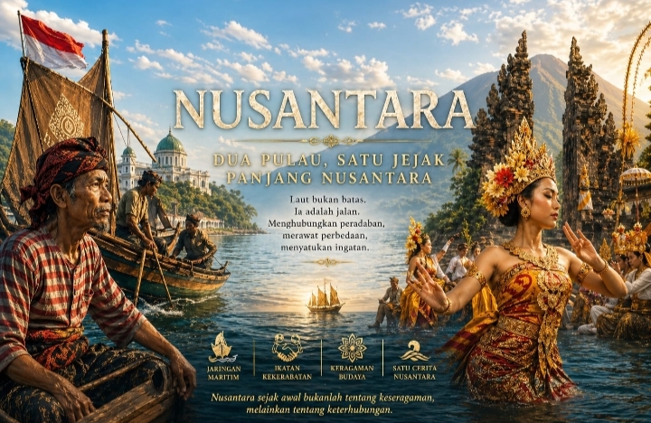 Sementara itu, di Pulau Bali, bunyi gamelan mengalun pelan dari balik pura. Ia bukan sekadar suara ritual, melainkan getaran yang merawat keterhubungan antara manusia, alam, dan yang transenden. Dua pulau, dua ritme kehidupan, namun sesungguhnya berbicara dalam satu bahasa yang sama: bahasa Nusantara.