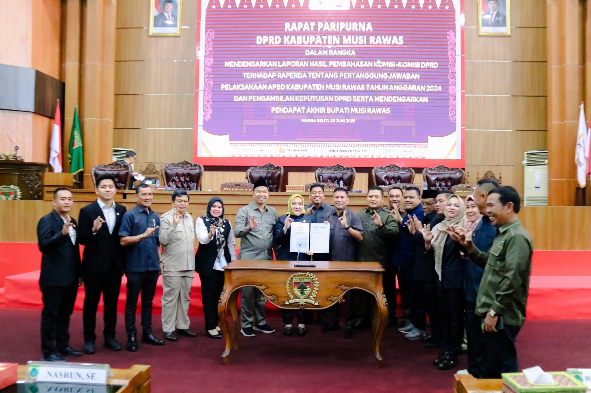 Penandatanganan berita acara pengesahan dilakukan oleh Wakil Ketua II DPRD Apt Yani Yandika Saputra bersama Bupati Musi Rawas, Hj. Ratna Machmud.