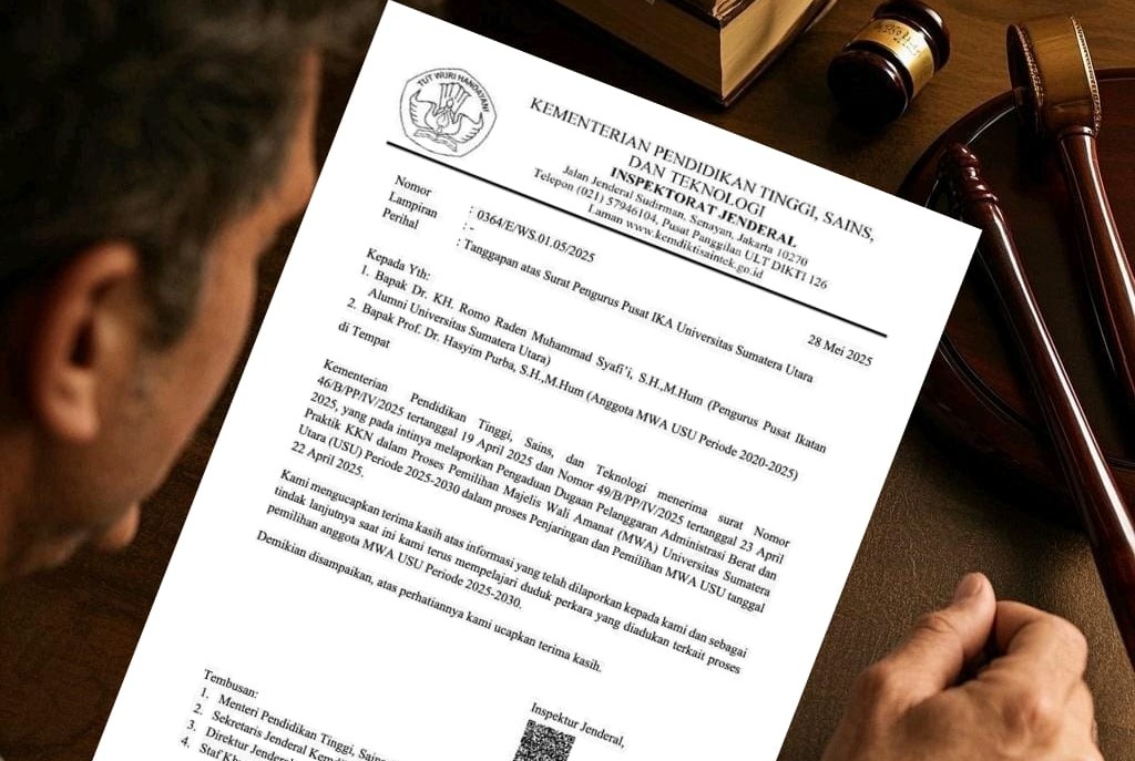 Surat resmi Inspektorat Jenderal Kementerian Pendidikan, Kebudayaan, Riset, dan Teknologi (Kemdikbudristek) Republik Indonesia bernomor 0364/E/WS.01.05/2025 tanggal 28 Mei 2025 menjadi sinyal negara terhadap dugaan serius: ada pelanggaran tata kelola dan dugaan praktik korupsi, kolusi, dan nepotisme (KKN) dalam pemilihan Majelis Wali Amanat (MWA) Universitas Sumatera Utara (USU) periode 2025–2030.
