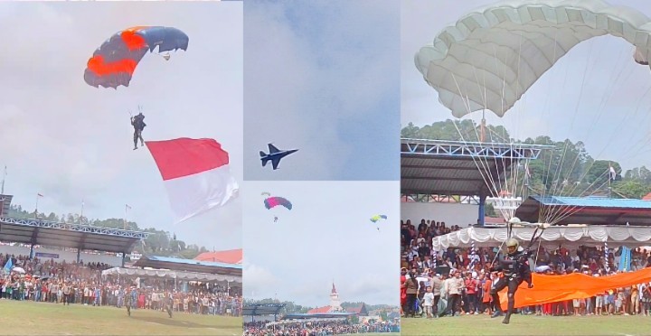 Atraksi spektakuler itu menjadi bagian dari kegiatan Semarak Dirgantara Nasional 2025 yang digelar oleh Pemerintah Kabupaten Tapanuli Utara bekerja sama dengan TNI Angkatan Udara (AU). Puluhan penerjun payung mendarat dengan mulus di Lapangan Mini Serbaguna Tarutung, disusul dengan aksi memukau fly pass pesawat tempur yang memeriahkan suasana.