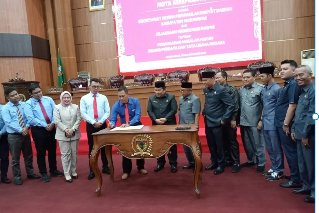 SWARA RAKYAT – MUSI RAWAS – DPRD Kabupaten Musi Rawas menandatangani Memorandum of Understanding (MoU) dengan Kejaksaan Negeri Musi Rawas tentang penanganan hukum bidang perdata dan hukum tata usaha negara.